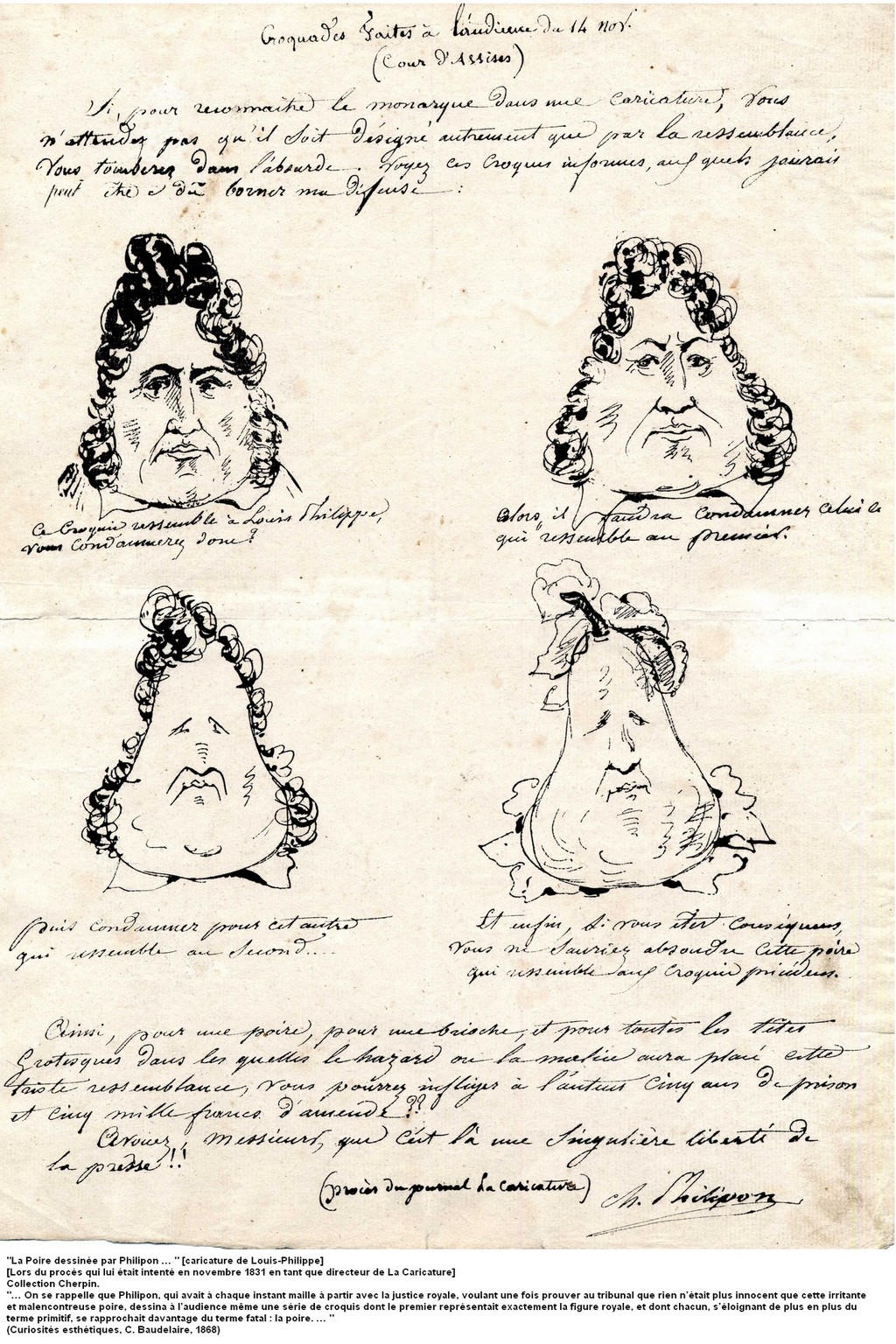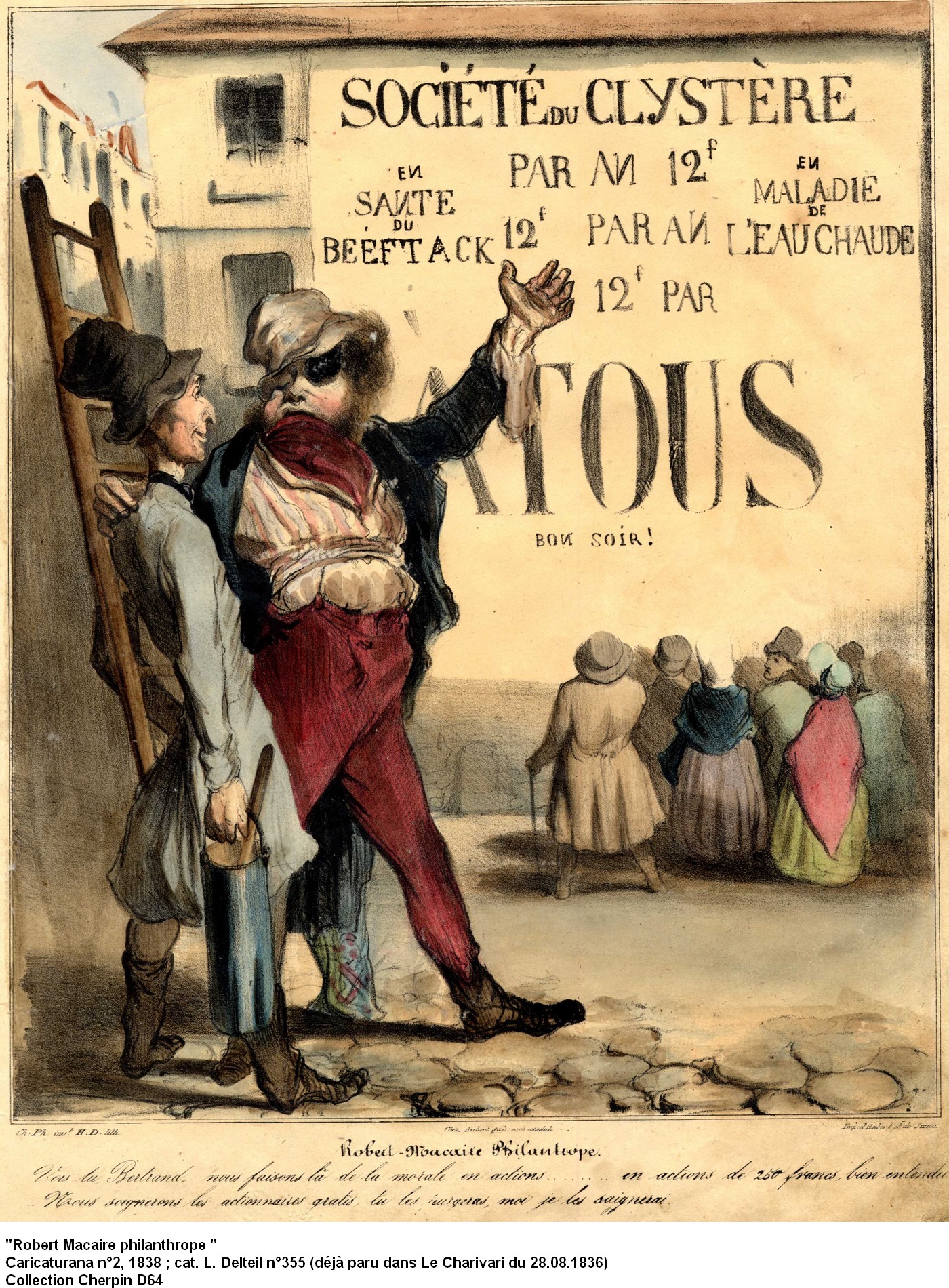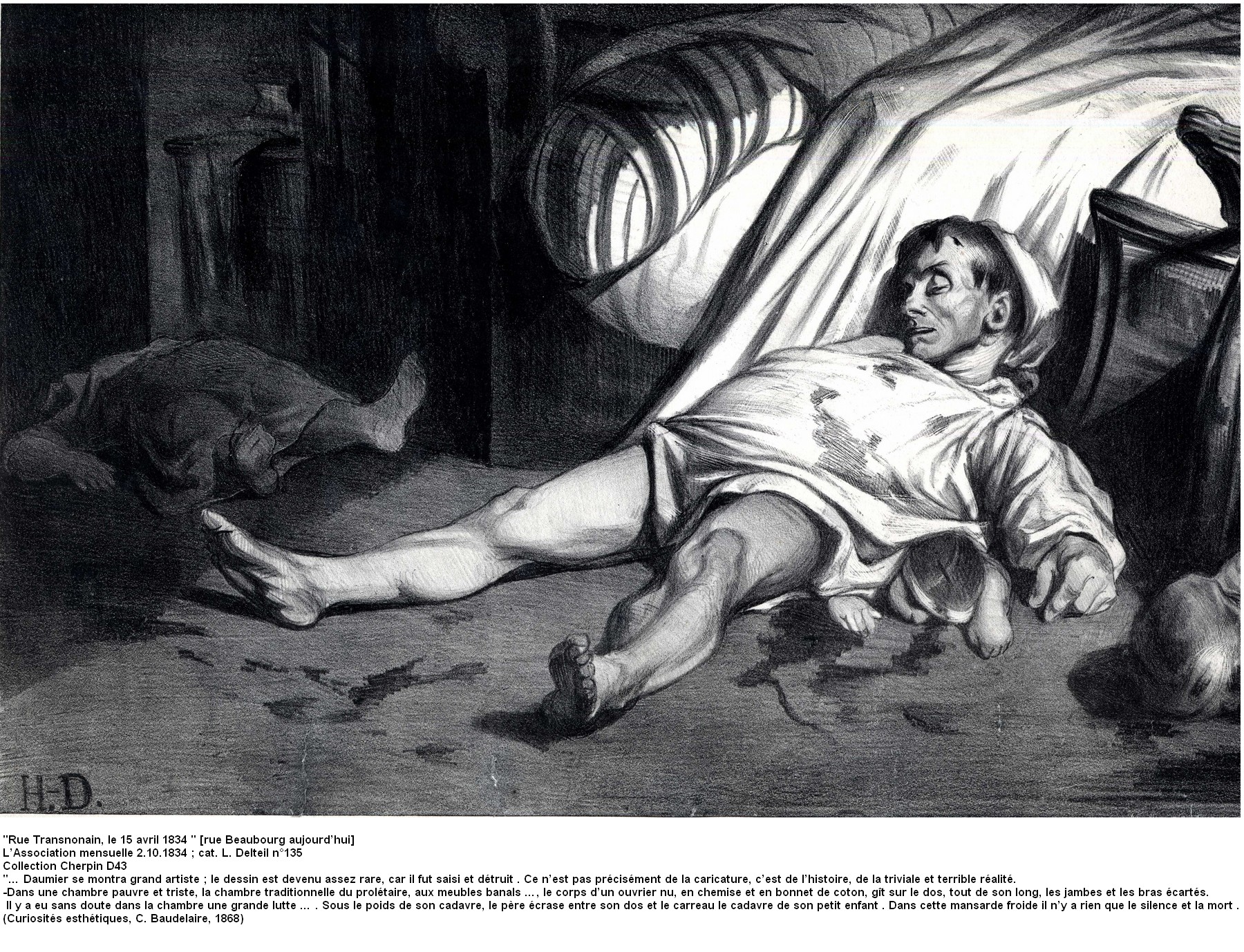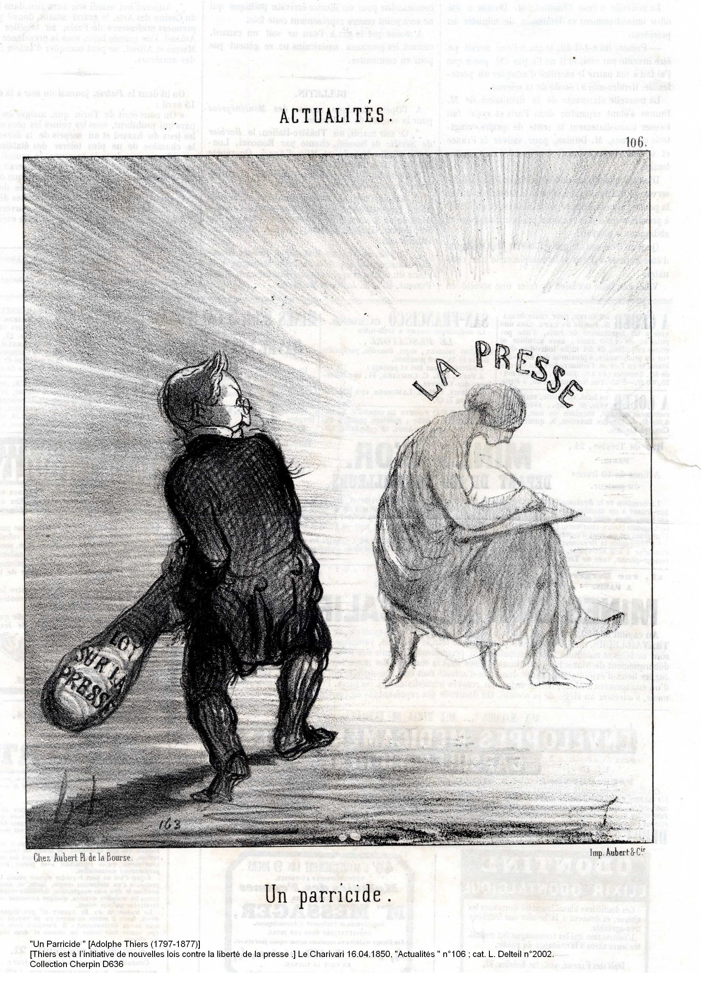 C’est à la fin des années 1980 que la Bibliothèque de Marseille se porte acquéreur de la collection Jean Cherpin. Avant la guerre ce collectionneur se prend de curiosité pour cet illustre Marseillais, considéré comme le plus grand caricaturiste de son époque : Honoré Daumier [1808 - 1879]. Il réunit alors archives, livres, sculptures et surtout estampes qui constituent aujourd’hui une source documentaire d’une remarquable richesse et témoignent de la vie sociale et politique en France au XIXe siècle. La collection d’estampes composée de lithographies exécutées entre 1830 et 1870 reflète le parcours de caricaturiste de Daumier. La facture fouillée et précise du dessin caractérise les premières planches. Daumier évoluera ensuite vers un style plus libre et plus mouvementé et défendra avec virulence ses idéaux libéraux. Sa verve endiablée à l’encontre des notabilités politiques et son sens critique aigu des évènements guideront la pointe de son crayon vers des dessins teintés parfois d’un lyrisme pathétique (La rue Transnonain, 1834). Les atteintes aux libertés de la presse le pousseront progressivement à la critique des mœurs où il dénoncera les travers et les ridicules des différents métiers de la société bourgeoise, et qu’illustrera avec bonheur et succès la série des Robert Macaire. Ce sont plus de 1500 estampes qui témoignent de cette presse satirique du XIXe siècle qui devint avec Charles Philipon (directeur de La Caricature puis du Charivari) et Honoré Daumier, le fer de lance de la caricature politique française.